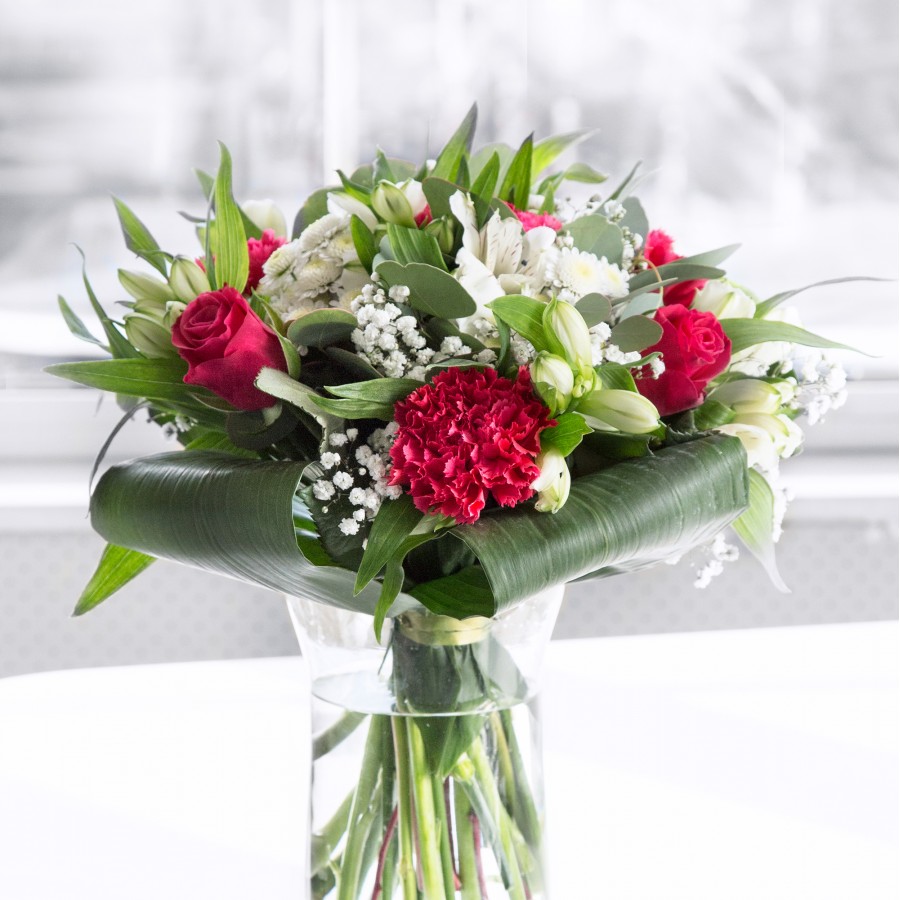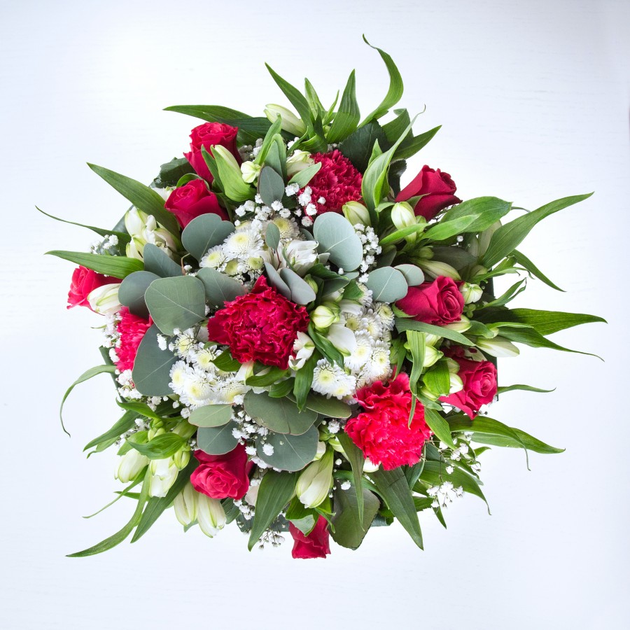 Discover the harmony of elegance with our Elegant Red & White Harmony bouquet. This stunning arrangement combines the richness of red roses and carnations with the delicate beauty of white chrysanthemums and gypsophila, artfully arranged with white alstroemeria and aspidistra leaves. Each bloom is hand-selected to ensure exceptional freshness and lasting beauty.
